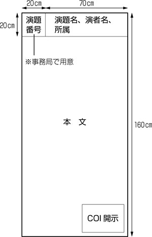 - タイトル部分(縦20 ㎝×横70 ㎝)に洟題名、発表者名、共著者名、所属を明記ください。